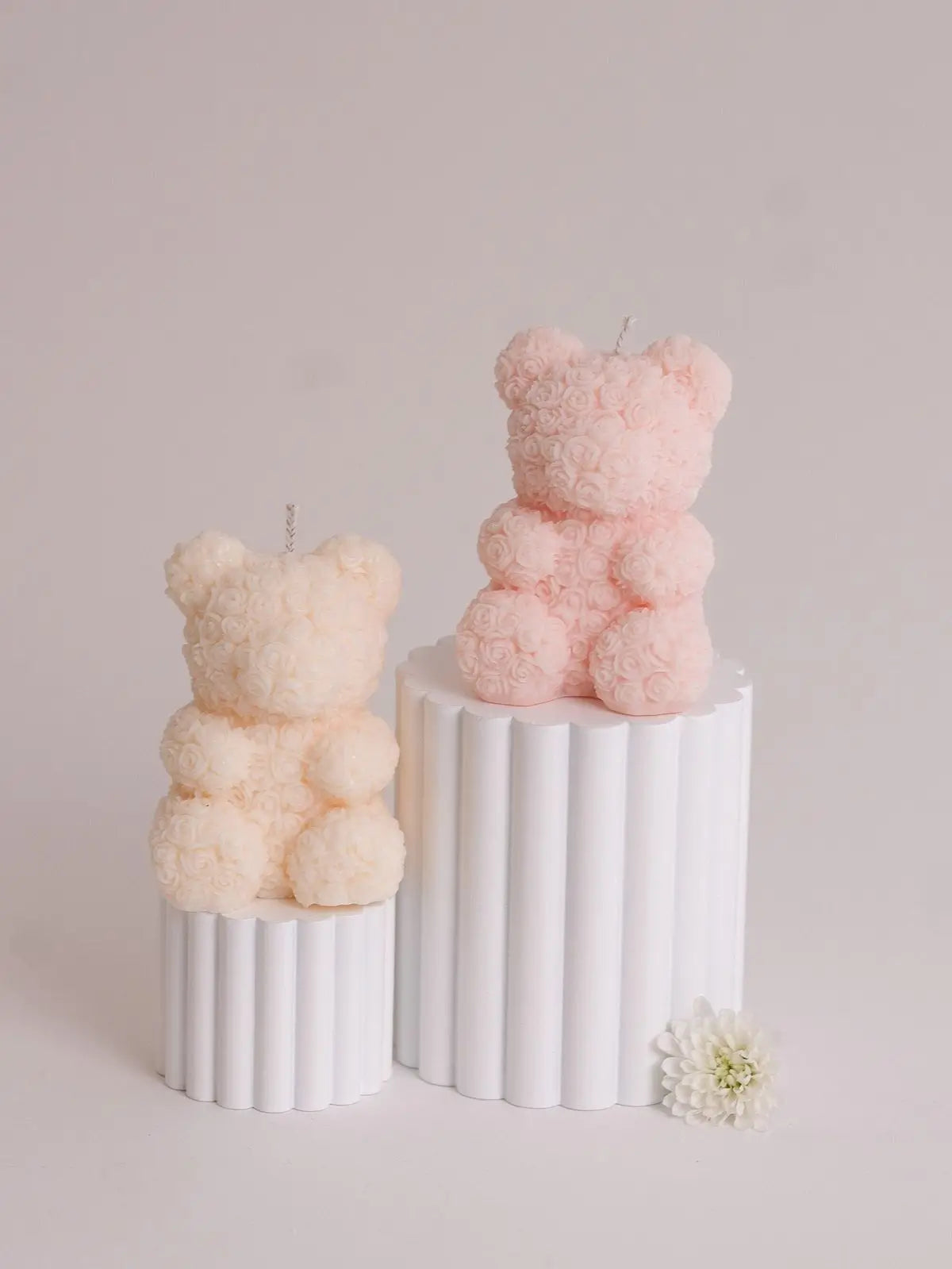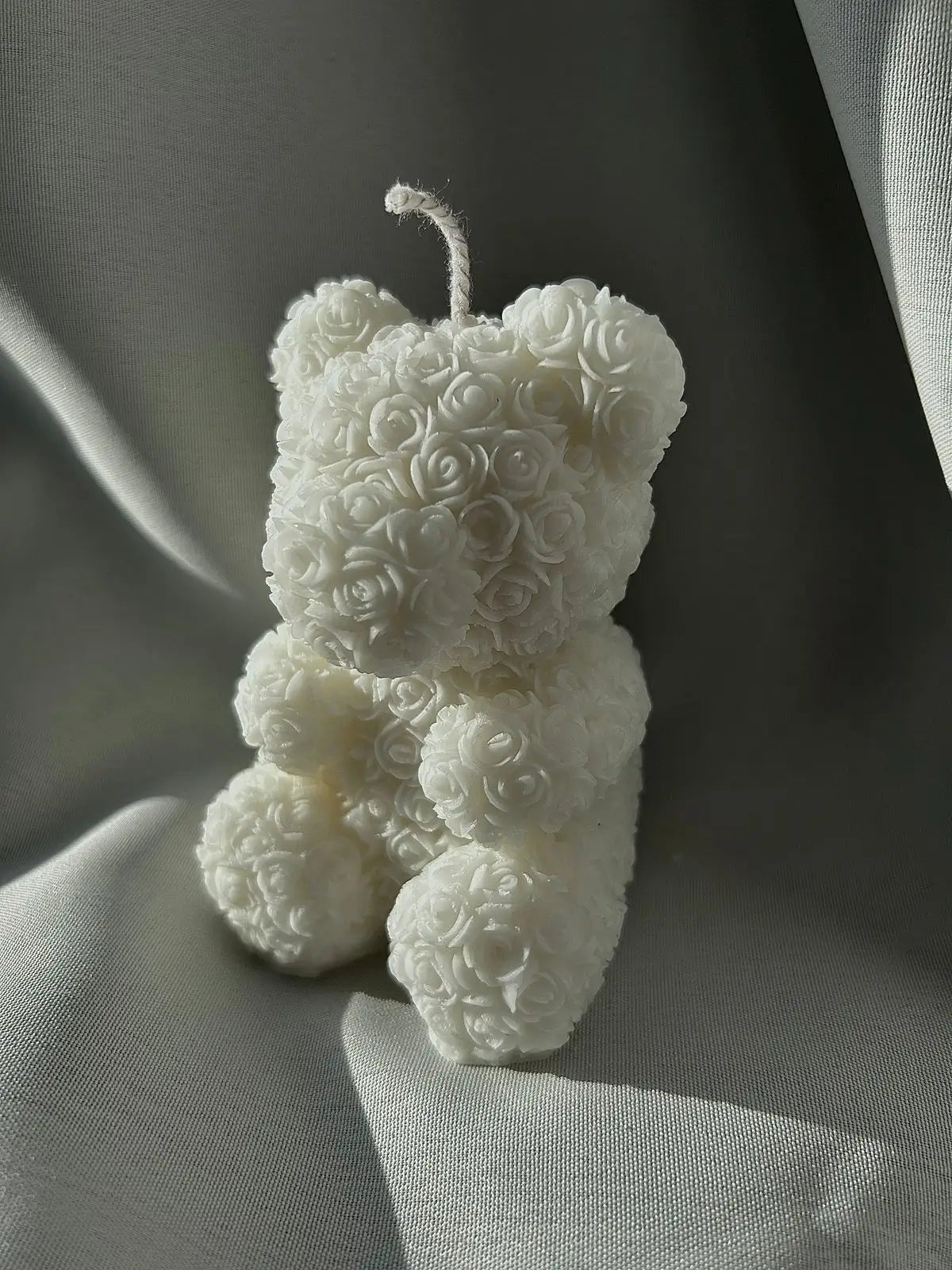Ръчно изработена свещ с форма на мече, покрито с деликатен релеф от рози.